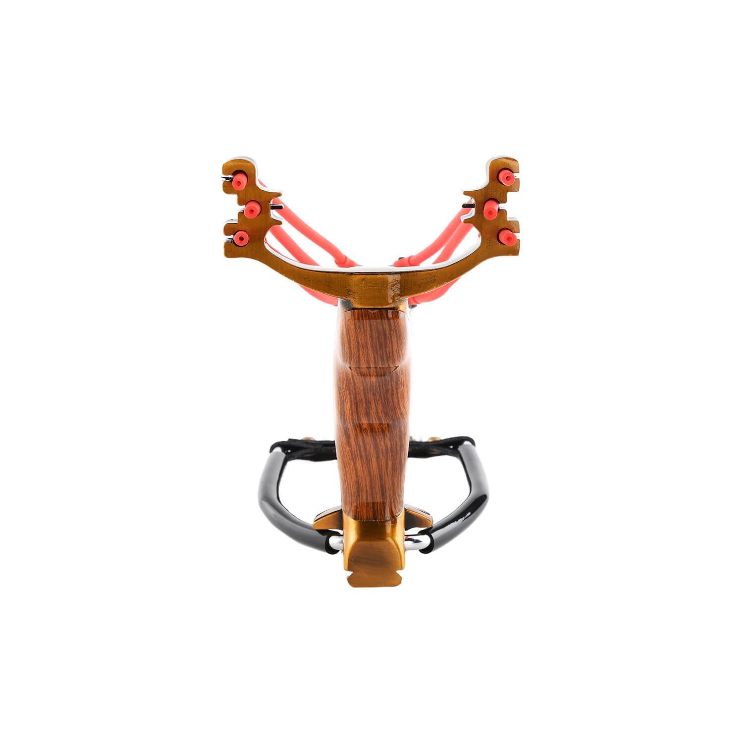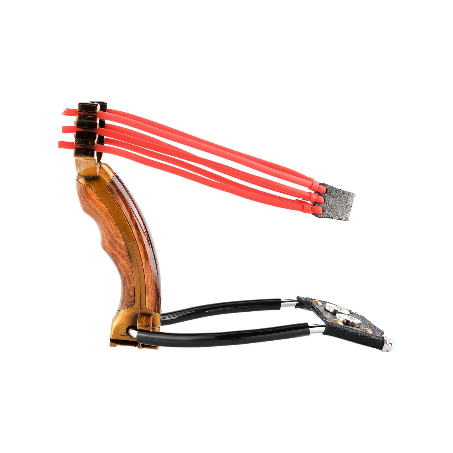 The Ballista 18 is designed with a beautiful golden wood handle that features a comfort curve for better functionality and comfortability. This heavy duty slingshot comes with two triple banded snap resistant rubber bands, and a wrist brace.